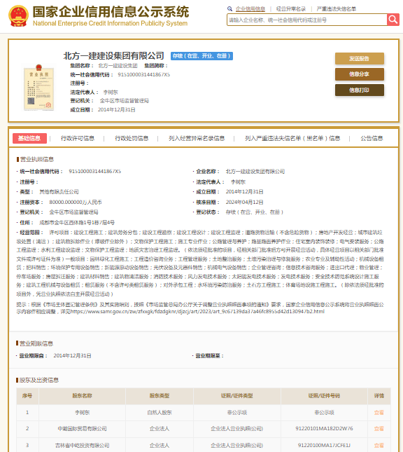 国家企业信用信息公示系统显示,北方一建建设集团有限公司成立于2014年,注册资本80000万元人民币,法定代表人为李树东。