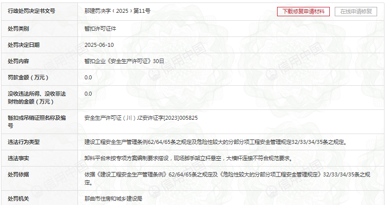 齐鲁晚报·齐鲁壹点记者于信用中国查询到,北方一建建设集团在6月10日亦曾收到罚单。据悉,该罚单违法事实是:卸料平台未按专项方案编制要求搭设,现场脚手架立杆悬空,大横杆连接不符合规范要求。对此,那曲市住房和城乡建设局暂扣其《安全生产许可证》30日。行政处罚决定书文号那建罚决字﹝2025﹞第11号。