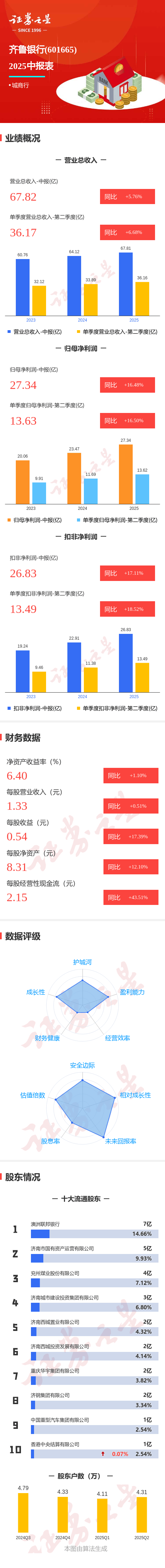 证券之星消息,齐鲁银行2025年中报显示,公司主营收入67.82亿元,同比上升5.76%;归母净利润27.34亿元,同比上升16.48%;扣非净利润26.83亿元,同比上升17.11%;其中2025年第二季度,公司单季度主营收入36.17亿元,同比上升6.69%;单季度归母净利润13.63亿元,同比上升16.5%;单季度扣非净利润13.49亿元,同比上升18.52%;负债率93.29%,投资收益11.1亿元。