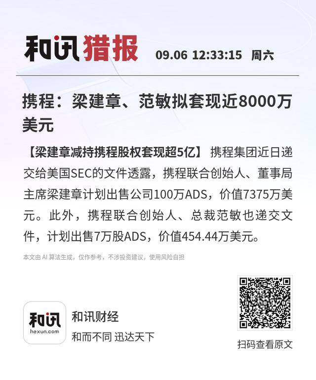 【梁建章减持携程股权套现超5亿】携程集团近日递交给美国SEC的文件透露,携程联合创始人、董事局主席梁建章计划出售公司100万ADS,价值7375万美元。此外,携程联合创始人、总裁范敏也递交文件,计划出售7万股ADS,价值454.44万美元。
