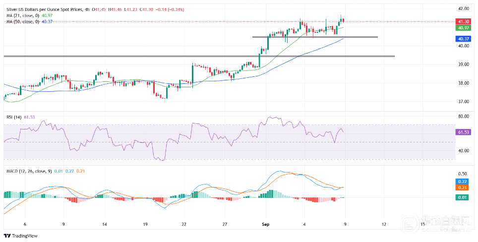 【华通白银网9月9日讯】•白银延续涨势至41.67美元的14年新高,随后回落至41.00美元。