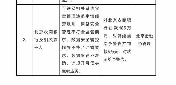 除对机构进行处罚外,监管还追究了相关责任人责任。北京农商银行相关责任人韩继炀被给予警告并罚款5万元,武凌被给予警告。