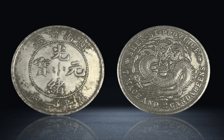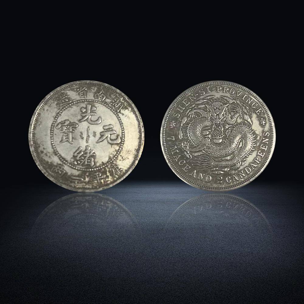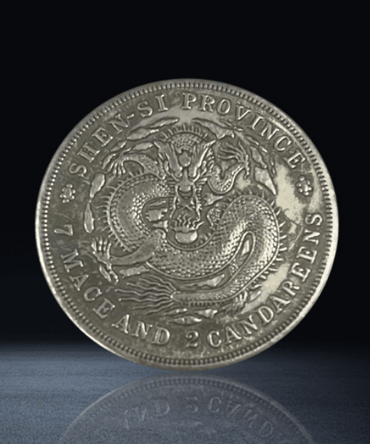 与正面的“湖南省造”形成鲜明对比,银币背面环绕神龙图案的英文为“SHEN - SI PROVINCE”(陕西省)以及“7 MACE AND 2 CANDAREENS”(七钱二分)。背面中央的神龙雕刻精美,龙身矫健,鳞片清晰,龙须飘逸,龙爪遒劲,尽显东方神龙的威严与灵动。但英文标识却指向陕西省,与正面的湖南省造信息完全矛盾,这种“张冠李戴”的错版设计,为这枚银币增添了神秘色彩。