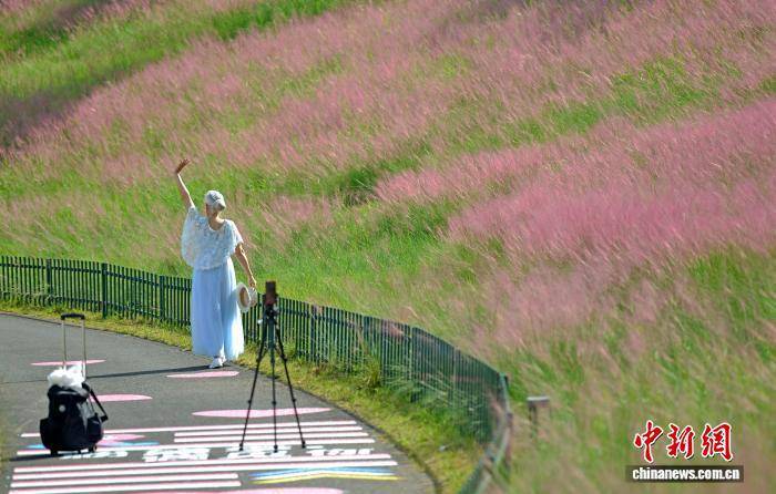 近日,广西南宁园博园里3万平方米的粉黛花迎来绚烂绽放,吸引众多民众前来打卡拍照,乐享初秋时光。图为民众在粉黛花旁打卡拍照。滕忠 摄