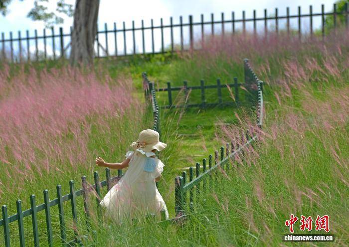 图为小朋友在粉黛花丛中穿行。滕忠 摄