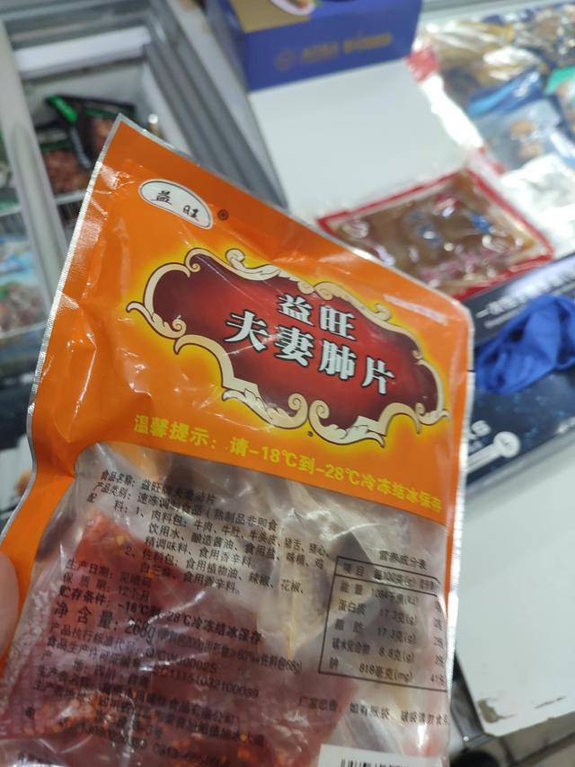 另一家预制菜商铺,主营川粤菜系。川味的夫妻肺片、口水鸡,粤式的脆皮乳鸽、牛肉丸,塞满了冰柜。夫妻肺片,解冻即可出餐,保存条件-18℃到-28℃,保质期12个月,268克,售价15元。如果整箱拿货,可以优惠到14元。