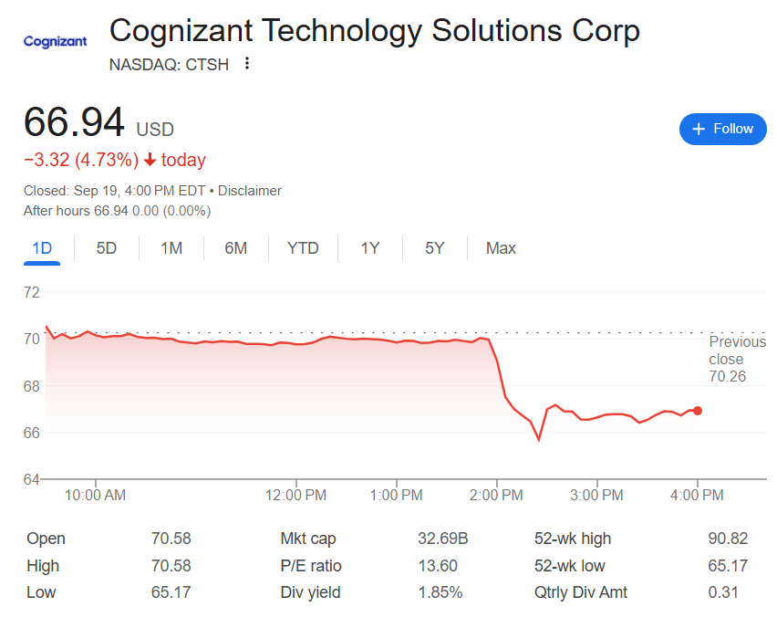 由于申请需求巨大,项目采用抽签制度分配名额,大学等非营利机构员工通常不受名额限制。消息传出后,严重依赖H-1B签证持有者的IT服务公司Cognizant股价周五下跌4.74%。