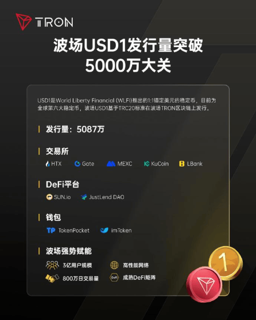 近日,波场TRON创始人孙宇晨在社交媒体上公布了一则重磅消息:波场网络原生稳定币USD1的发行量已强势突破5000万大关。更令人瞩目的是,这一里程碑距离USD1在波场主网完成铸造,仅仅过去了三个月。