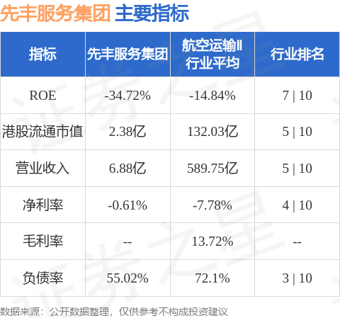 先丰服务集团港股市值2.38亿港元,在航空运输Ⅱ行业中排名第5。主要指标见下表: