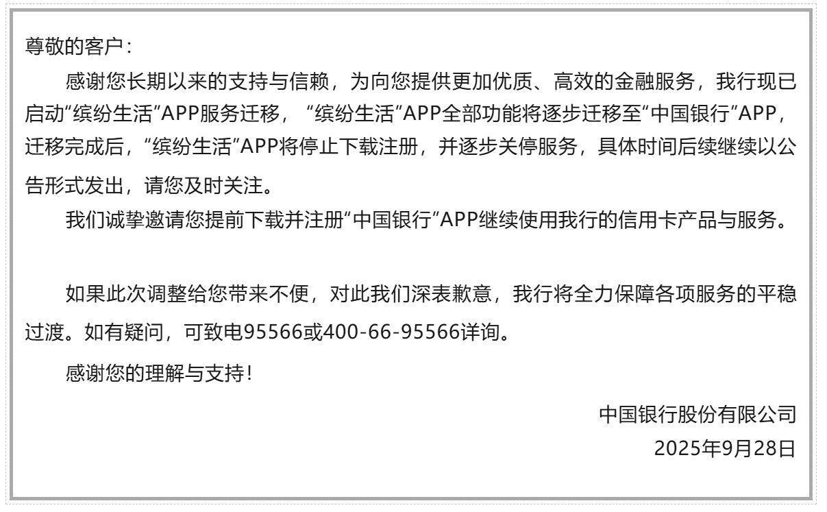 9月28日,中国银行公告称,该行已启动“缤纷生活”App服务迁移,“缤纷生活”App全部功能将逐步迁移至“中国银行”App,迁移完成后,“缤纷生活”App将停止下载注册,并逐步关停服务,具体时间后续继续以公告形式发出。