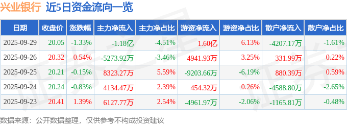 证券之星消息,截至2025年9月29日收盘,兴业银行(601166)报收于20.05元,下跌1.33%,换手率0.61%,成交量128.87万手,成交额26.07亿元。
