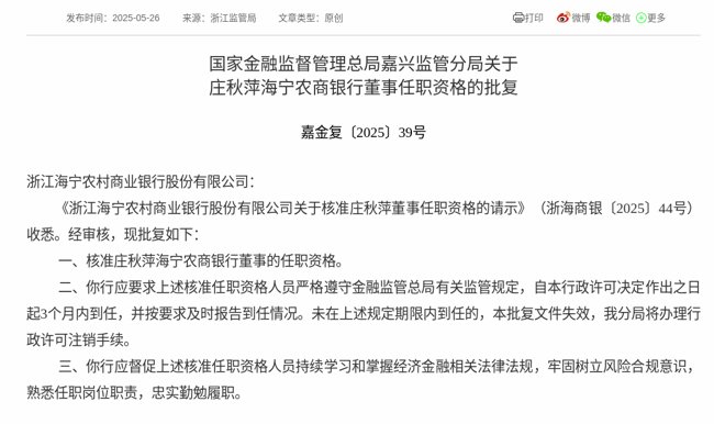 2025年5月23日,根据国家金融监督管理总局消息,《浙江海宁农村商业银行股份有限公司关于核准庄秋萍董事任职资格的请示》获得通过,批复庄秋萍浙江海宁农村商业银行股份有限公司董事的任职资格。