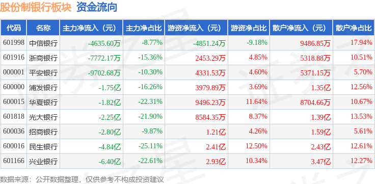 从资金流向上来看,当日股份制银行板块主力资金净流出22.07亿元,游资资金净流入8.94亿元,散户资金净流入13.12亿元。股份制银行板块个股资金流向见下表: