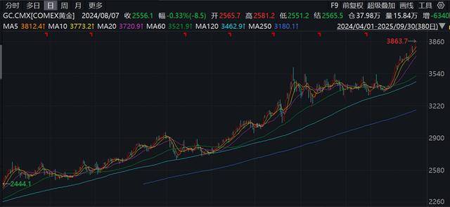 北京时间9月30日凌晨,国际贵金属期货普遍收涨,COMEX黄金期货涨1.42%报3862.90美元/盎司,COMEX白银期货涨0.97%报47.11美元/盎司;同时,现货黄金突破3800美元/盎司,续创历史新高。对此有市场人士分析认为,受美国政府停摆阴影和美联储降息预期升温共同推动,市场避险需求增加。
