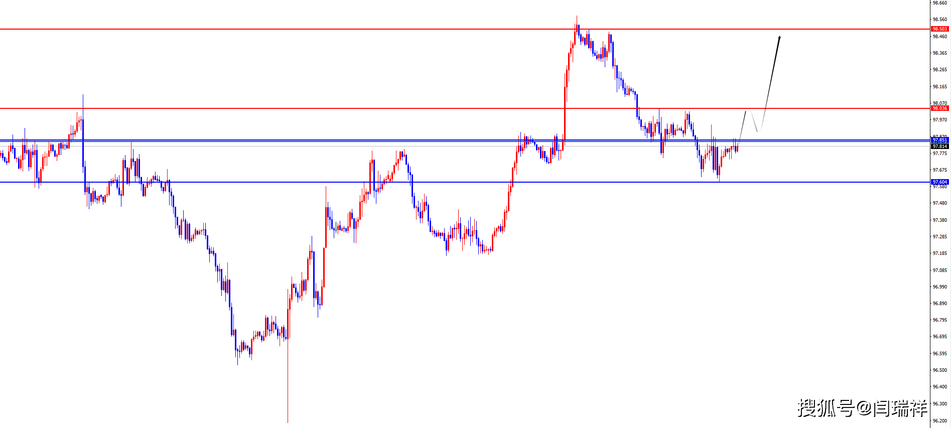 从多周期分析,周线级别来看近期价格在周线关键上下盘整,目前周线支撑于97.85区域,同时在上周价格站上周线阻力,后续看中期看多头延续。从日线级别看,随着时间的推移目前日线支撑于97.60区域,价格此位置之上波段进一步上涨。从四小时上看,目前看四小时阻力于97.60位置,昨日强调关注四小时分水岭能否站稳,随着时间的推移今日持续关注四小时站稳表现,站稳后继续看延续。