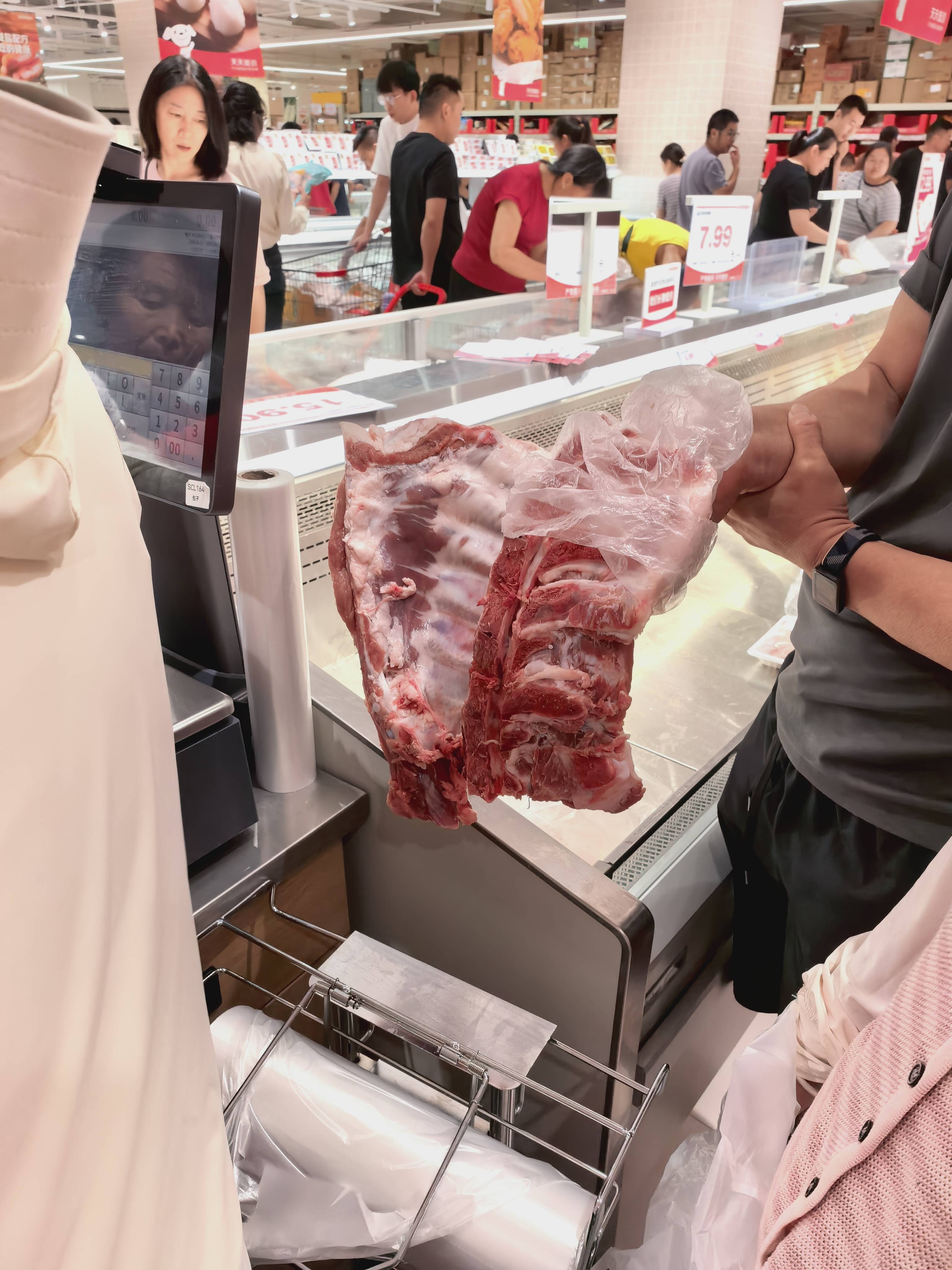 这次去宿迁新开的折扣超市,父亲直冲肉类区。排骨赤裸地堆在冰柜里,顾客太多,这里不提供切和砍的服务,父亲拎起一扇就走,得自己找塑料袋装。