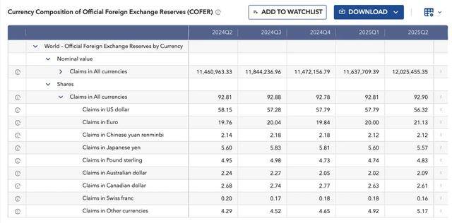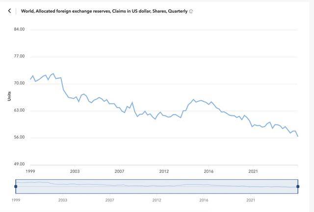 美元在全球央行外汇储备中的占比正在逐渐下降,当前已降至三十年来最低水平。
