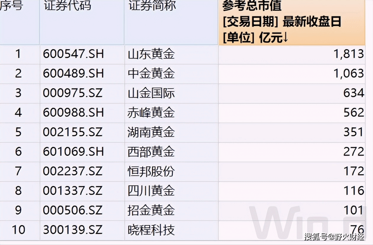 申万“有色金属—黄金”板块中共有10家上市企业,市值超过千亿元是山东黄金(600547)和中金黄金(600489),分别为1813亿元和1063亿元,紫金黄金市值超过山东黄金和中金公司市值之和。