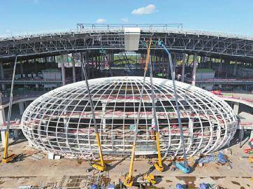 “各班组注意,趁着天气好加快进度。”国庆中秋佳节,成自铁路天府站项目施工现场,机器轰鸣,800余名建设者坚守岗位。金属屋面装饰层(凤羽)施工、外幕墙施工、室内装修及机电安装等工序全面铺开,5个作业面同步有序推进。在连接天府站落客平台的不远处,天府站配套市政工程也在同步抓紧施工。