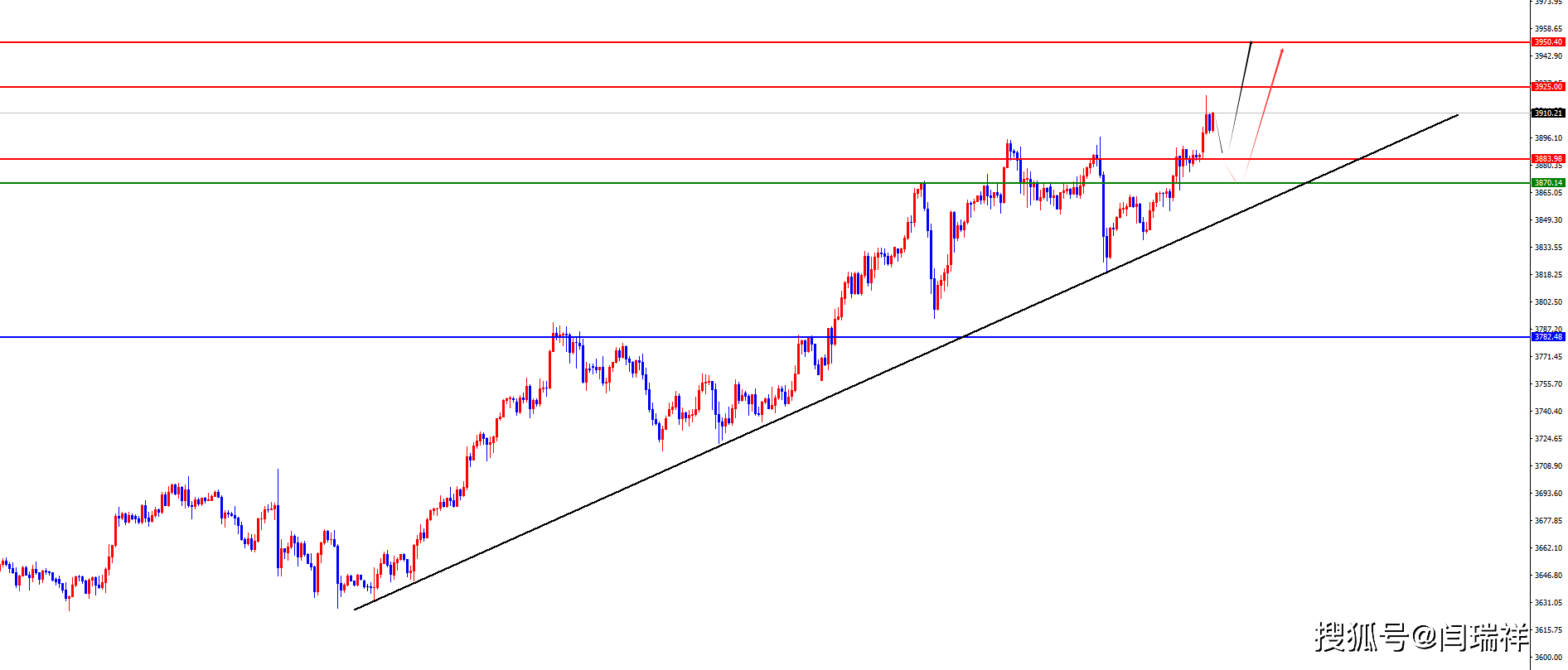 从多周期分析,首先观察月线节奏,从长线上看3130位置是长线走势的分水岭,价格在此位置之上长线多对待即可。从周线级别看,目前周线多空分水岭于3531位置,价格在此位置之上中线多对待即可。从日线级别看,暂时需要关注3782区域支撑,此位置之上波段多对待,目前继续右侧交易方式对待。从四小时上看,近期四小时上价格有两种方式,第一中是价格距离日线支撑较远时,价格依托四小时支撑上涨,价格进行下破四小时支撑后没有延续,而是依托下破四小时支撑后低点位置继续上涨。第二中距离日线较近时,价格测试到日线支撑后上涨。上周五价格明显属于第一种情况。目前四小时上暂时关注3870及3884两个支撑。一小时上,早盘直接再度强势突破3900位置,则目前强势对待,短线上早盘低点成关键,激进者在早盘低点没有下破前维持多,保守者依托四小时支撑看上涨即可。