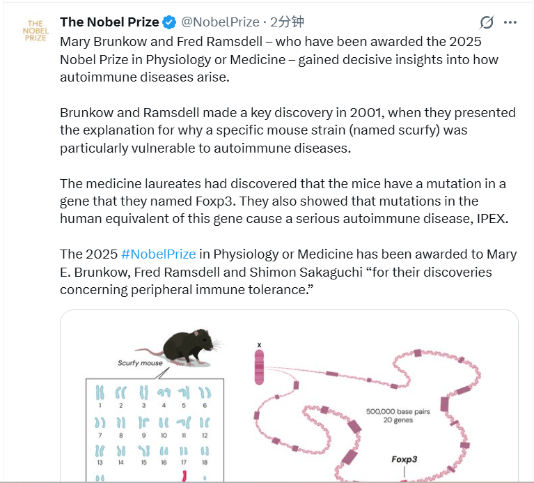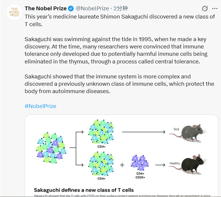 10月6日,2025年诺贝尔生理学或医学奖授予了在免疫耐受领域做出奠基性贡献的科学家。