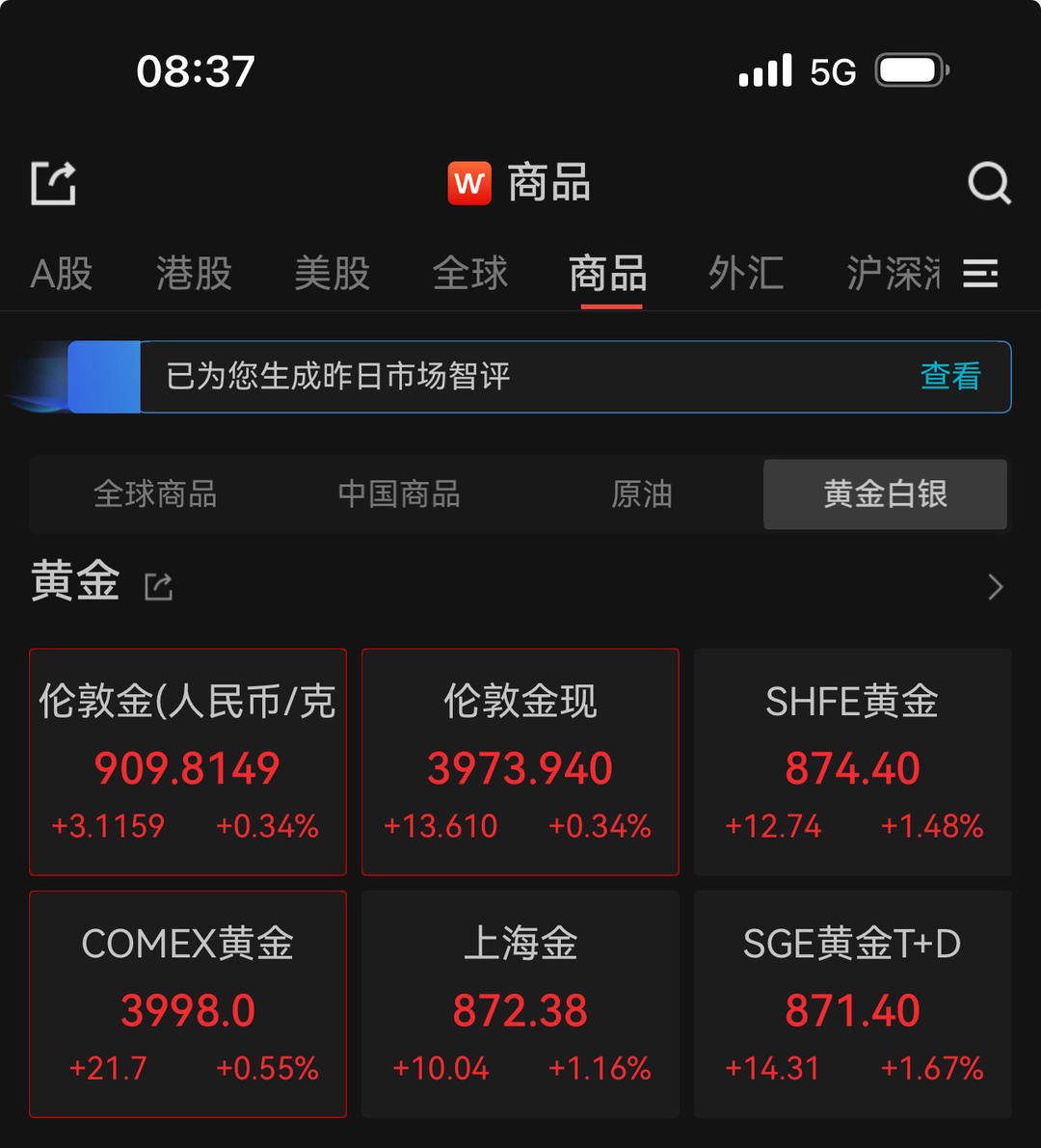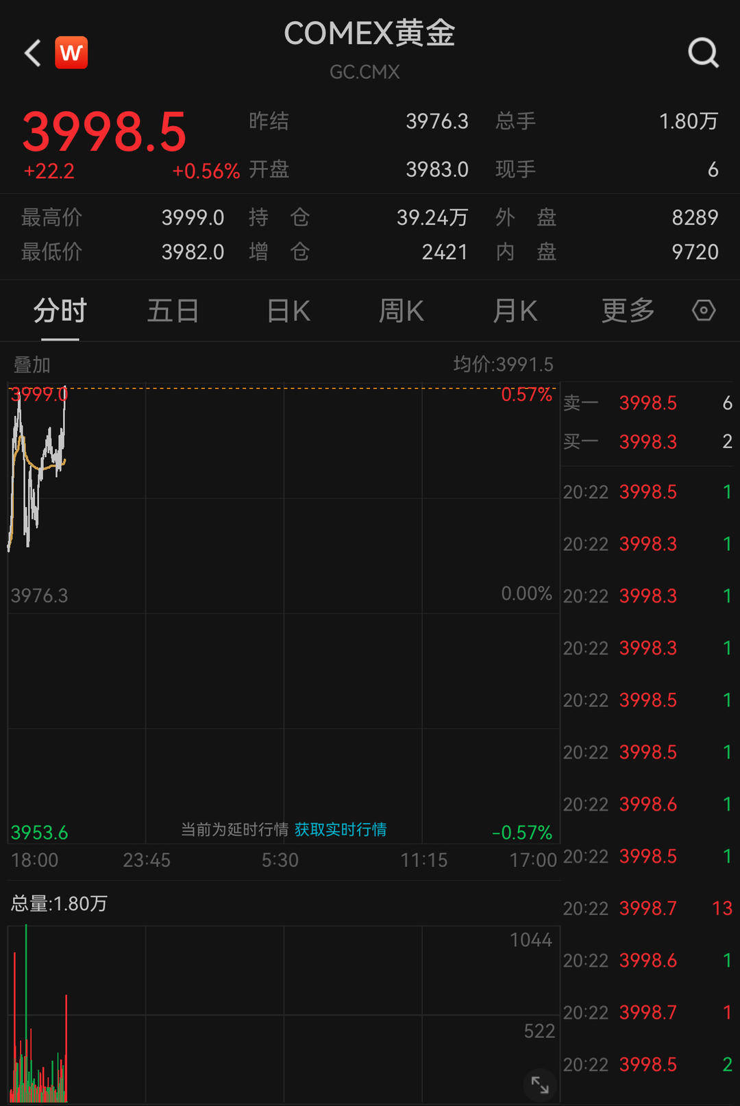 扬子晚报网10月7日讯(记者 范晓林)纽约期金历史首次触及4000美元/盎司整数大关,日内涨幅0.55%,年内大涨逾50%。现货黄金报3976.94美元/盎司,同样创下历史新高。