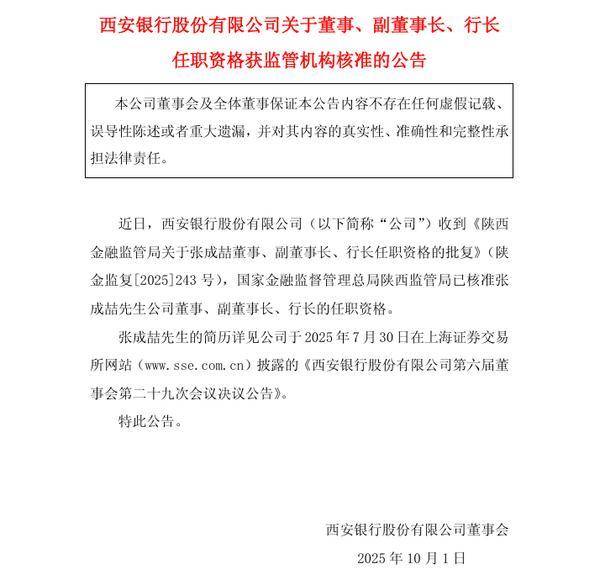中国网财经10月9日讯 近日,西安银行发布公告称,该行收到《陕西金融监管局关于张成喆董事、副董事长、行长任职资格的批复》(陕金监复[2025]243号),国家金融监督管理总局陕西监管局已核准张成喆西安银行董事、副董事长、行长的任职资格。
