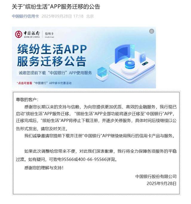 9月28日,中国银行发布公告称,该行已启动“缤纷生活”App服务迁移,“缤纷生活”App全部功能将逐步迁移至“中国银行”App。迁移完成后,“缤纷生活”App将停止下载注册,并逐步关停服务。据梳理,自2024年以来已有十余家银行密集关停独立APP,其中信用卡类与直销银行类应用成为整合重灾区。