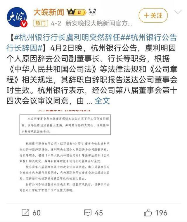 今年杭州银行交出的成绩单非常可观,净利润持续上涨,但是杭州银行的掌舵人却在不久后递交了辞呈。