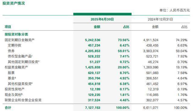 从具体资产配置结构来看,债券在投资资产的占比达59.01%,权益类金融资产占比20%,其中股票资产为6201.37亿元,较年初增加1190.54亿元,占比提升至8.7%。