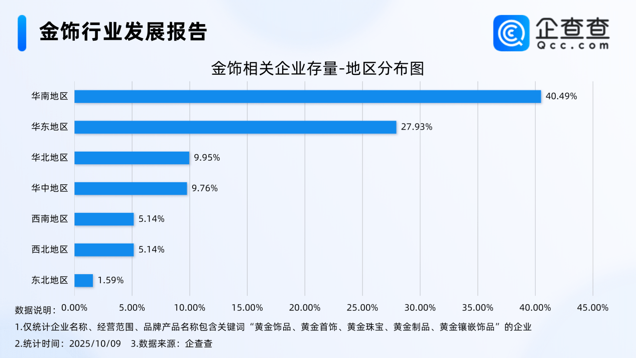 企查查数据显示,从地区分布来看,金饰相关企业具有高度地域集中性,密集分布在华南地区,占比达40.49%。其次,分布在华东地区的相关企业占比27.93%。分布在华北、华中等地区的相关企业占比均不足10%。