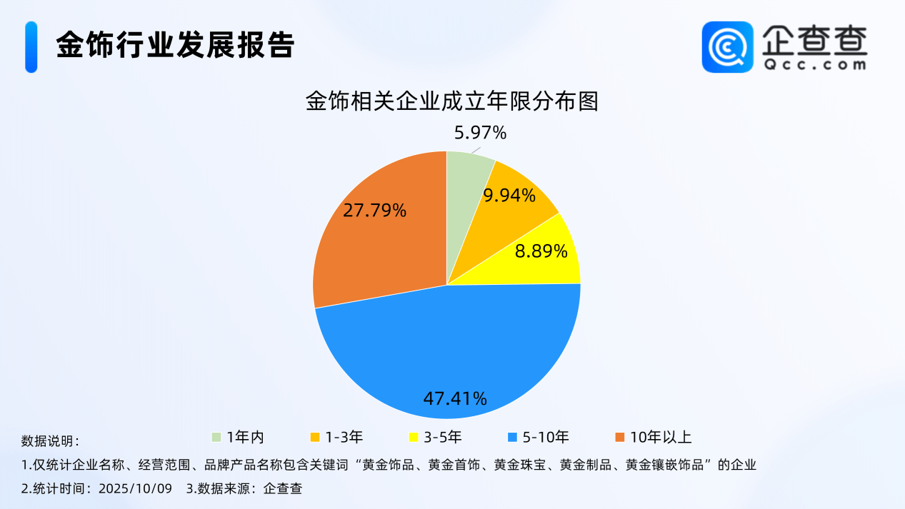 企查查数据显示,国内现存金饰相关企业6.34万家。从经营时间来看,金饰相关企业多为老牌企业,成立年限在5年以上的企业超七成,其中在5-10年的相关企业最多,占比47.41%,成立年限在10年以上的相关企业占比27.79%。注册量方面,2024年全年注册4585家相关企业,同比增长8.37%。