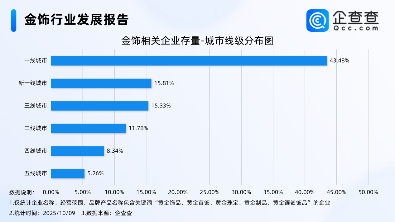 企查查数据显示,从城市线级来看,金饰相关企业主要分布在一线城市,占比达43.48%。其次,分布在新一线城市、三线城市的相关企业分别占比15.81%、15.33%。(信网记者)