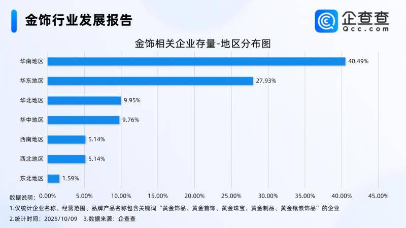 企查查最新数据显示,国内现存金饰相关企业6.34万家,其中近半数(40.49%)密集分布在华南地区,广东以绝对优势成为“黄金大本营”。长三角地区紧随其后,占比27.93%,而华北、华中等区域占比不足10%。行业分析指出,华南地区依托珠三角成熟的珠宝加工产业链和出口优势,已形成全球性产业聚集地。