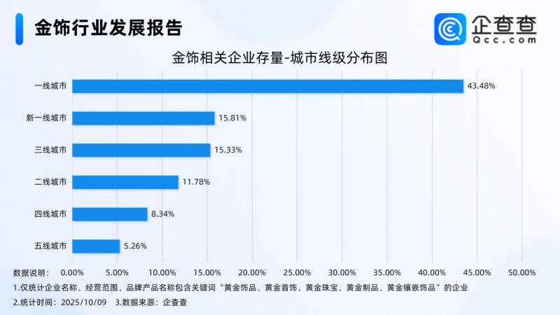 从城市分布看,43.48%的金饰企业扎根一线城市,新一线和三线城市分别占比15.81%和15.33%。北京SKP、深圳水贝等商圈成为黄金消费的“风向标”,高净值客群与年轻消费者共同推动高端化、个性化需求。