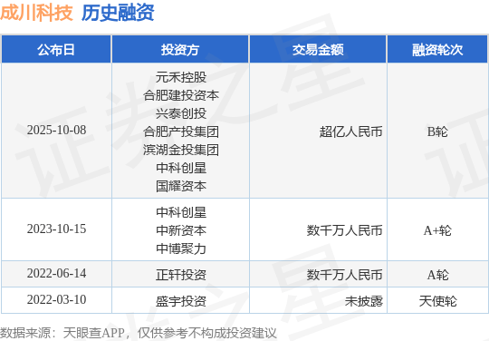 证券之星消息,根据天眼查APP于10月8日公布的信息整理,成川科技(苏州)有限公司B轮融资,融资额超亿人民币,参与投资的机构包括元禾控股,合肥建投资本,兴泰创投,合肥产投集团,滨湖金投集团,中科创星,国耀资本。
