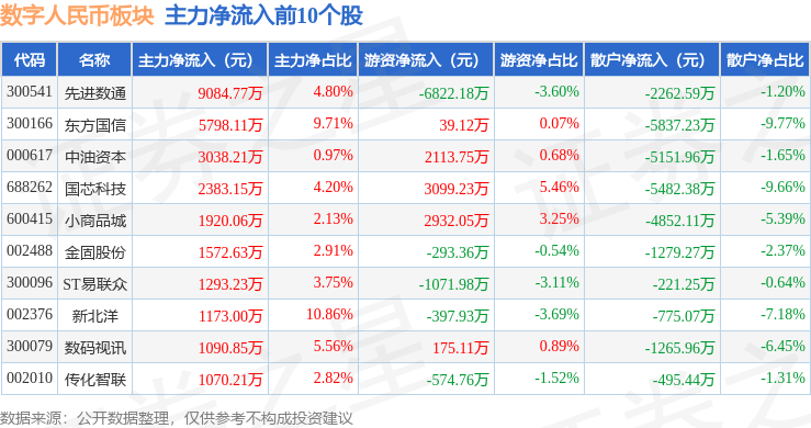 从资金流向上来看,当日数字人民币板块主力资金净流出41.07亿元,游资资金净流入18.68亿元,散户资金净流入22.39亿元。数字人民币板块个股资金流向见下表: