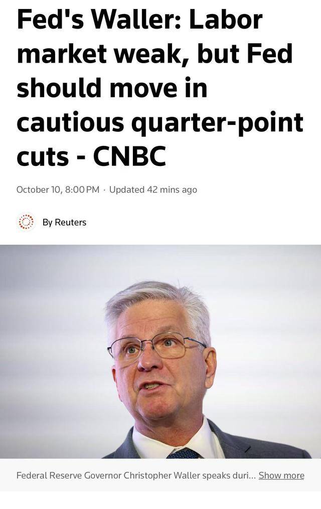 据路透社10月10日报道,美联储理事沃勒(Christopher Waller) 在CNBC《Squawk Box》节目中表示,私营部门数据显示就业市场依然疲弱,其对未来几次会议降息25个基点持开放态度,但强调政策制定者应保持谨慎态度。沃勒表示,先降25个基点,观察后续发展。