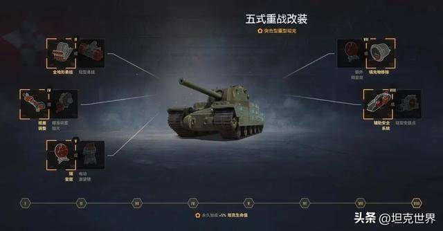 五式重战属于“突击型重型坦克”。该车在战地改装达到满级后,可以获得额外的5%坦克生命值,还可以增加多项性能升级与1项配件加成栏位选择。性能改装玩家可以选择全地形悬挂、视差调整、隔音层、填充物移除与辅助安全系统以加强坦克战斗力,具体选择按照玩家战斗风格微调。