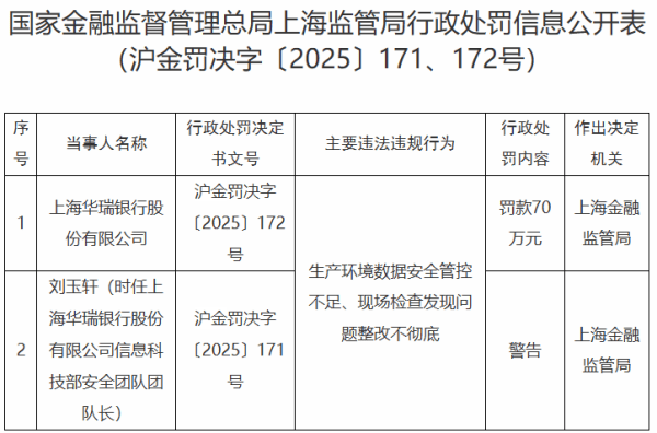 国家金融监督管理总局上海监管局公布的处罚信息显示,因生产环境数据安全管控不足、现场检查发现问题整改不彻底,上海华瑞银行股份有限公司被罚款70万元,时任公司信息科技部安全团队团队长刘玉轩被警告。
