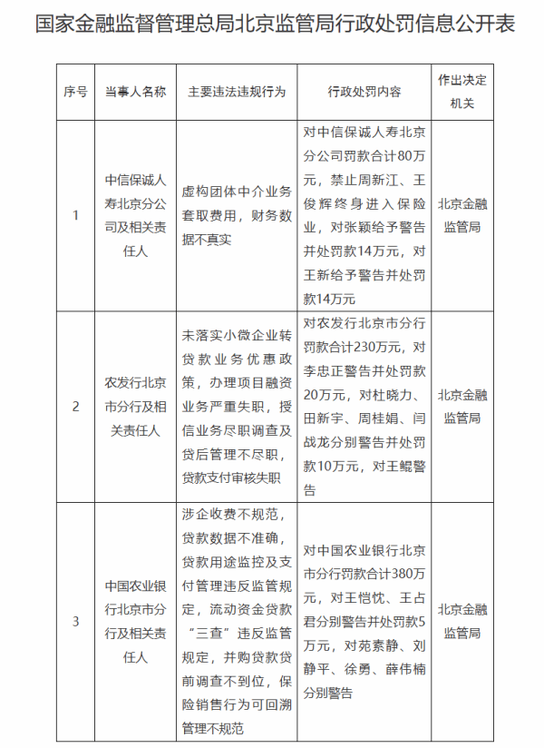 国家金融监督管理总局北京监管局对三家机构开出罚单。其中,因虚构团体中介业务套取费用,财务数据不真实,中信保诚人寿北京分公司被罚款合计80万元,相关责任人周新江、王俊辉终身禁止进入保险业,张颖被警告并处罚款14万元,王新被警告并处罚款14万元。