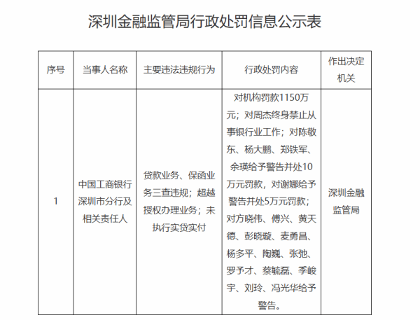 深圳金融监管局行政处罚信息公开表显示,因贷款业务、保函业务三查违规,超越授权办理业务,未执行实贷实付,中国工商银行深圳市分行被罚款1150万元,相关责任人周杰终身禁止从事银行业工作;陈敬东、杨大鹏、郑铁军、余瑛被警告并处10万元罚款,谢娜被警告并处5万元罚款;方晓伟、傅兴、黄天德、彭晓璇、麦勇昌、杨多平、陶巍、张弛、罗予才、蔡毓磊、季峻宇、刘玲、冯光华被警告。