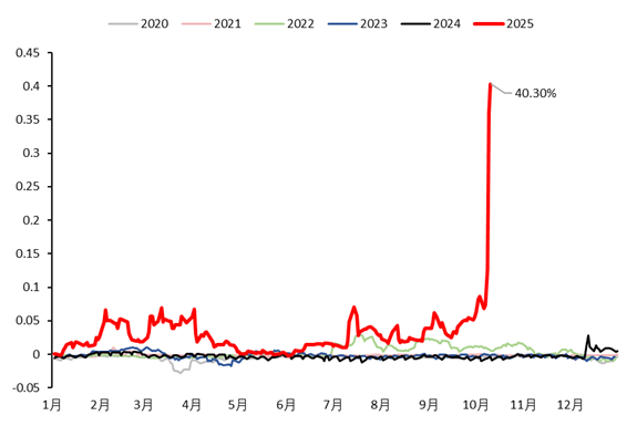 截至周五收盘,纽约期银近月合约(指期货交易中距离当前日期最近且即将到期的合约)与伦敦银现的价差达到2.73美元/盎司,为近年来的高位。目前,伦敦白银现货一个月期隐含租赁利率已升至40.3%。