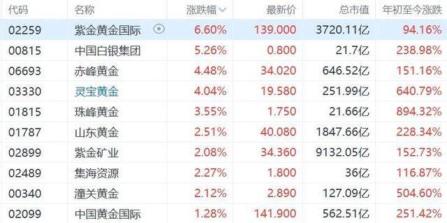 中美经贸博弈再度升级,避险资金推动金价重新上涨,现货黄金今日盘中再创历史新高价4060美元/盎司。金价上涨带动港股市场黄金股逆势走强,其中,紫金黄金国际涨超6%,中国白银集团涨超5%,赤峰黄金、灵宝黄金涨超4%,珠峰黄金涨超3%,山东黄金、紫金矿业、集海资源、潼关黄金涨超2%。