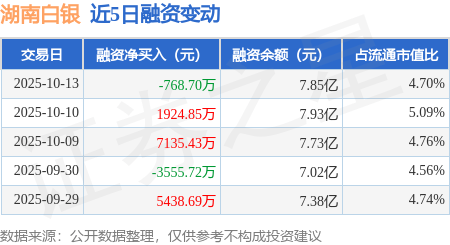 证券之星消息,10月13日,湖南白银(002716)融资买入3.08亿元,融资偿还3.16亿元,融资净卖出768.7万元,融资余额7.85亿元,近20个交易日中有13个交易日出现融资净买入。