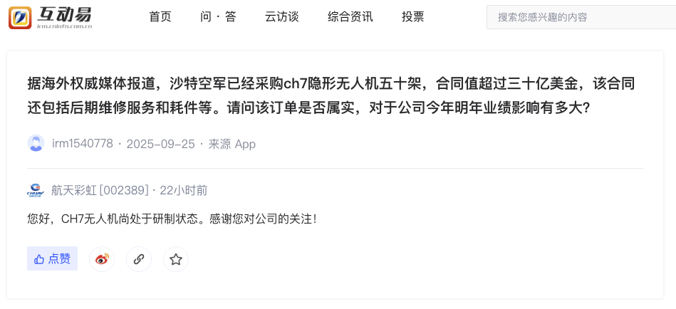 10月13日,有投资者在深交所互动易平台向航天彩虹提问:据海外权威媒体报道,沙特空军已经采购ch7隐形无人机五十架,合同值超过三十亿美金,该合同还包括后期维修服务和耗件等。请问该订单是否属实?对于公司今年明年业绩影响有多大?航天彩虹对此回应称,CH7无人机尚处于研制状态。