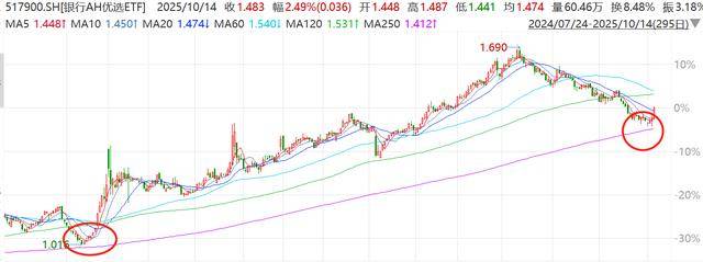 从历史走势来看,银行AH优选ETF(517900)此前连续回调,时隔一年多时间再次回落至年线附近。