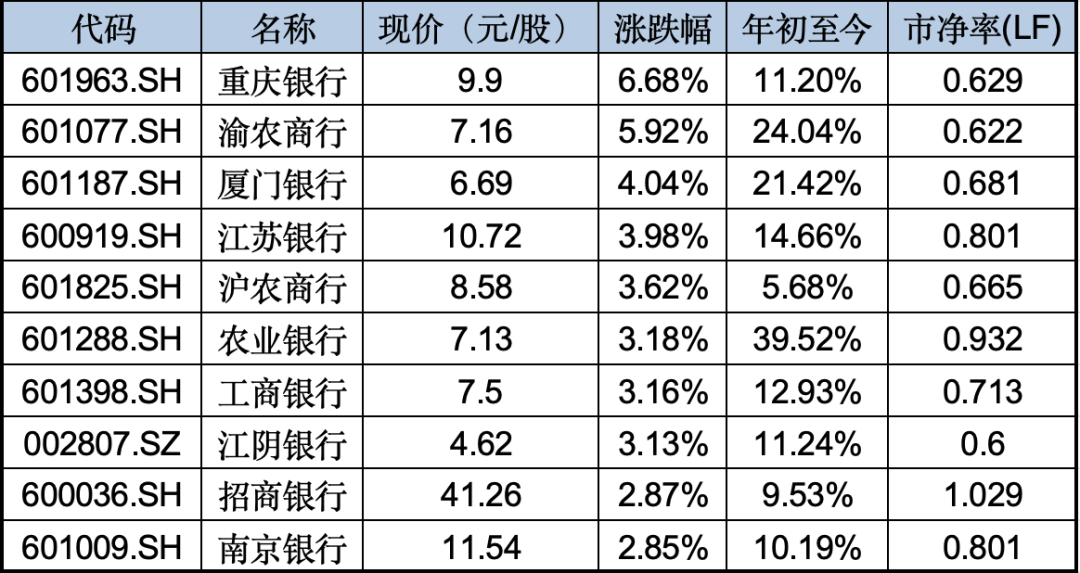 银行股方面,中小银行涨幅居前。重庆银行收涨6.68%,涨幅居首;渝农商行、厦门银行紧随其后,涨幅均超4%;江苏银行、沪农商行等多家银行涨幅逾3%。42家上市银行中涨幅最小的齐鲁银行涨0.83%。