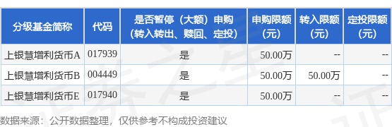 证券之星消息,10月15日上银基金管理有限公司发布《上银慧增利货币市场基金暂停代销渠道大额申购、转换转入 及定期定额投资业务的公告》。公告中提示,为了保证基金的平稳运作,保护基金持有人的利益,自2025年10月15日起上银慧增利货币市场基金暂停代销渠道大额申购、转换转入 及定期定额投资业务,申购、转换转入上限金额为50.0万元,下属分级基金调整明细如下: