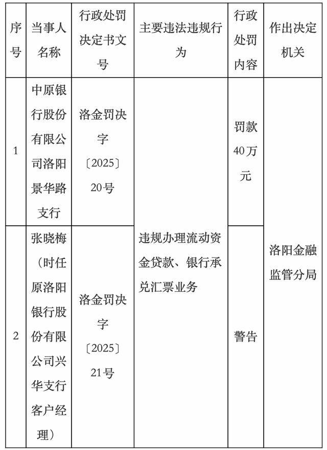 据国家金融监督管理总局洛阳监管分局10月9日发布的行政处罚信息公示表,因违规办理流动资金贷款、银行承兑汇票业务,中原银行股份有限公司洛阳景华路支行被罚40万元。